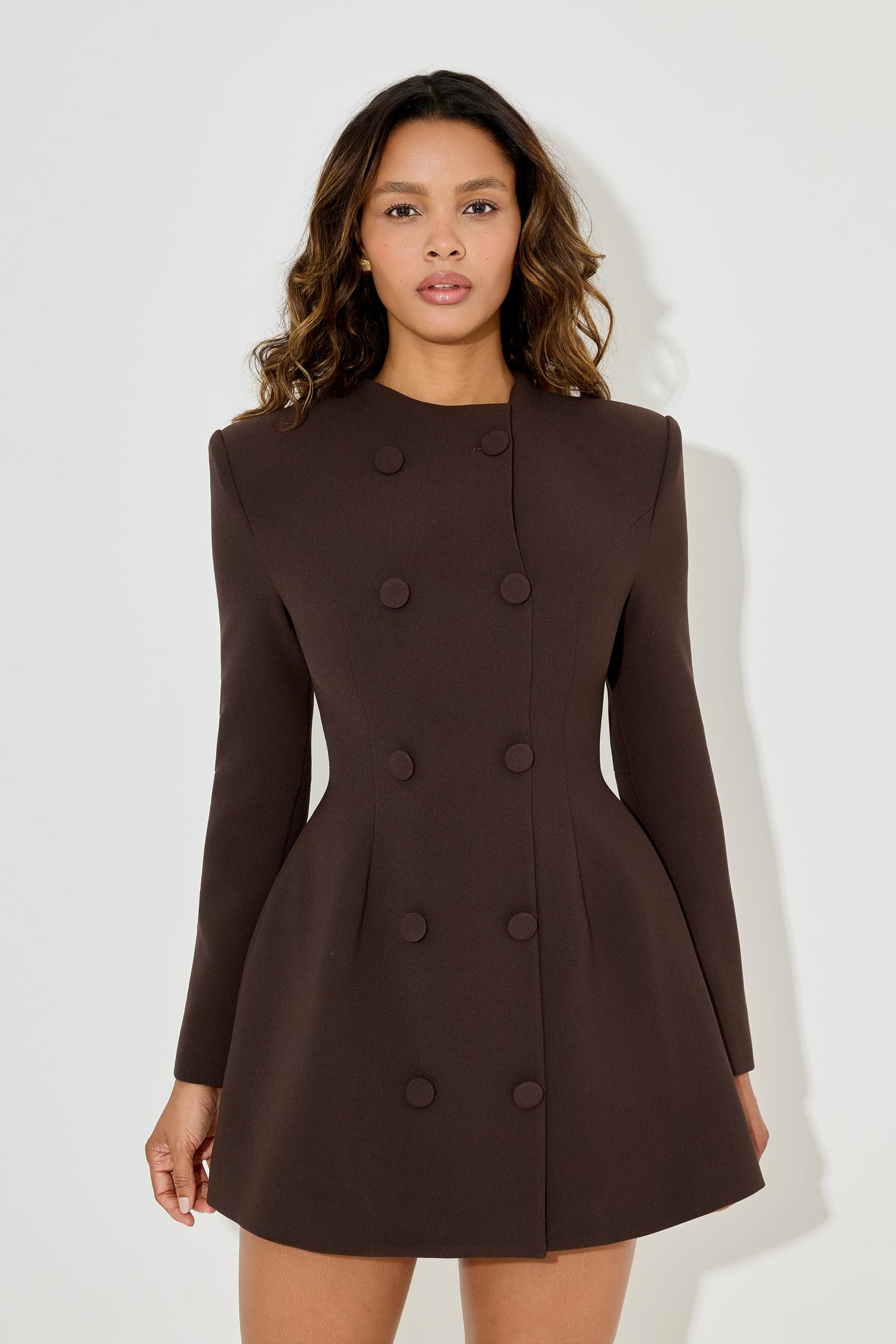 Introducing our new button mini dress designed for the modern Muse who embraces effortless sophistication. Featuring a graceful high neckline and a flattering tailored silhouette, it’s a piece that transitions seamlessly from chic day plans to evening outings. Ensuring it remains a staple in your wardrobe for seasons to come.